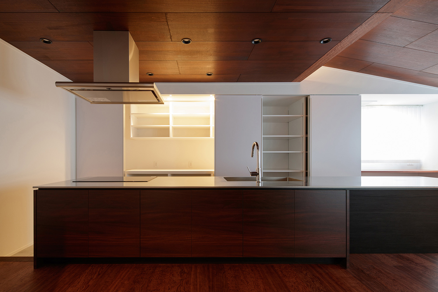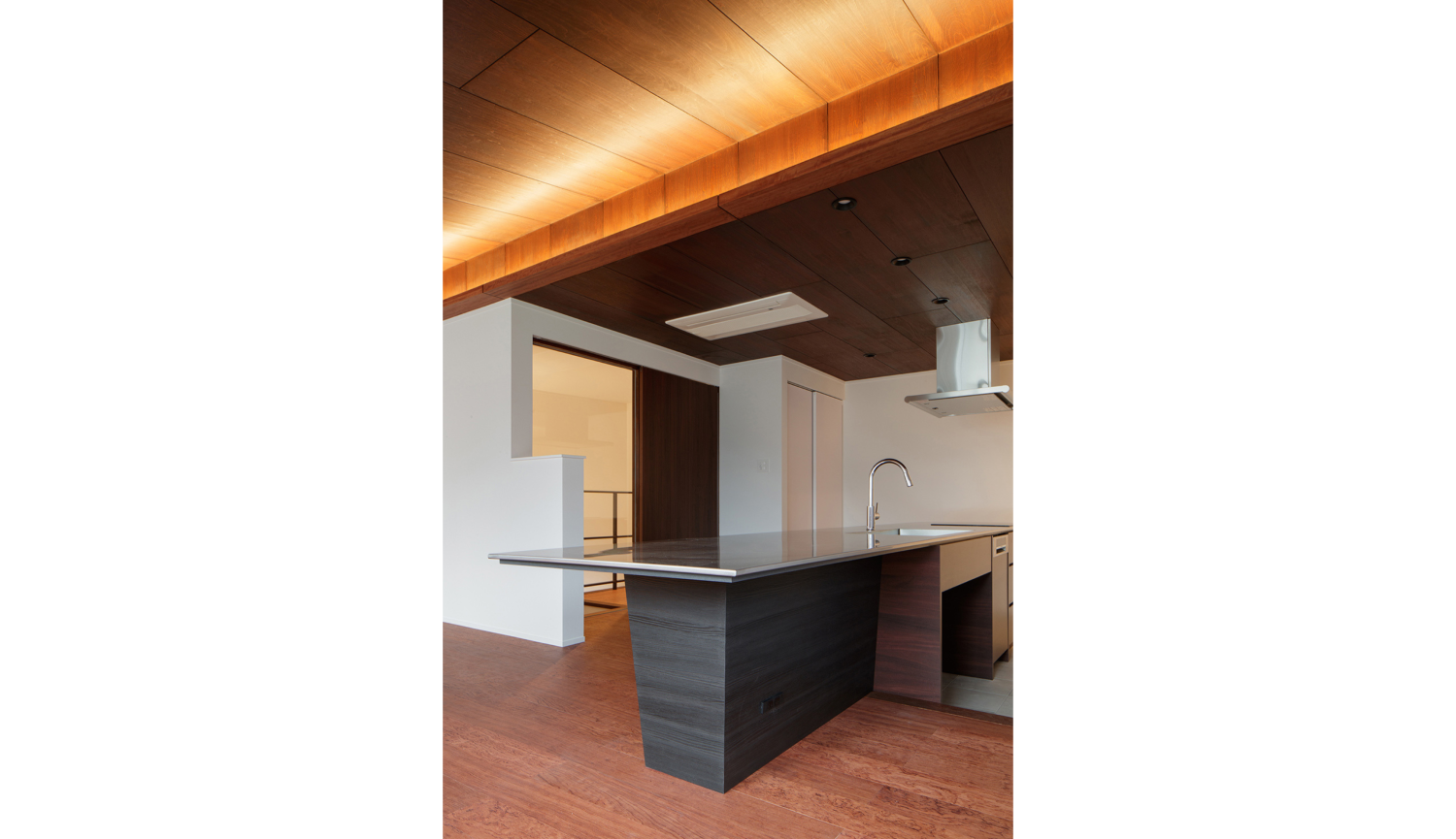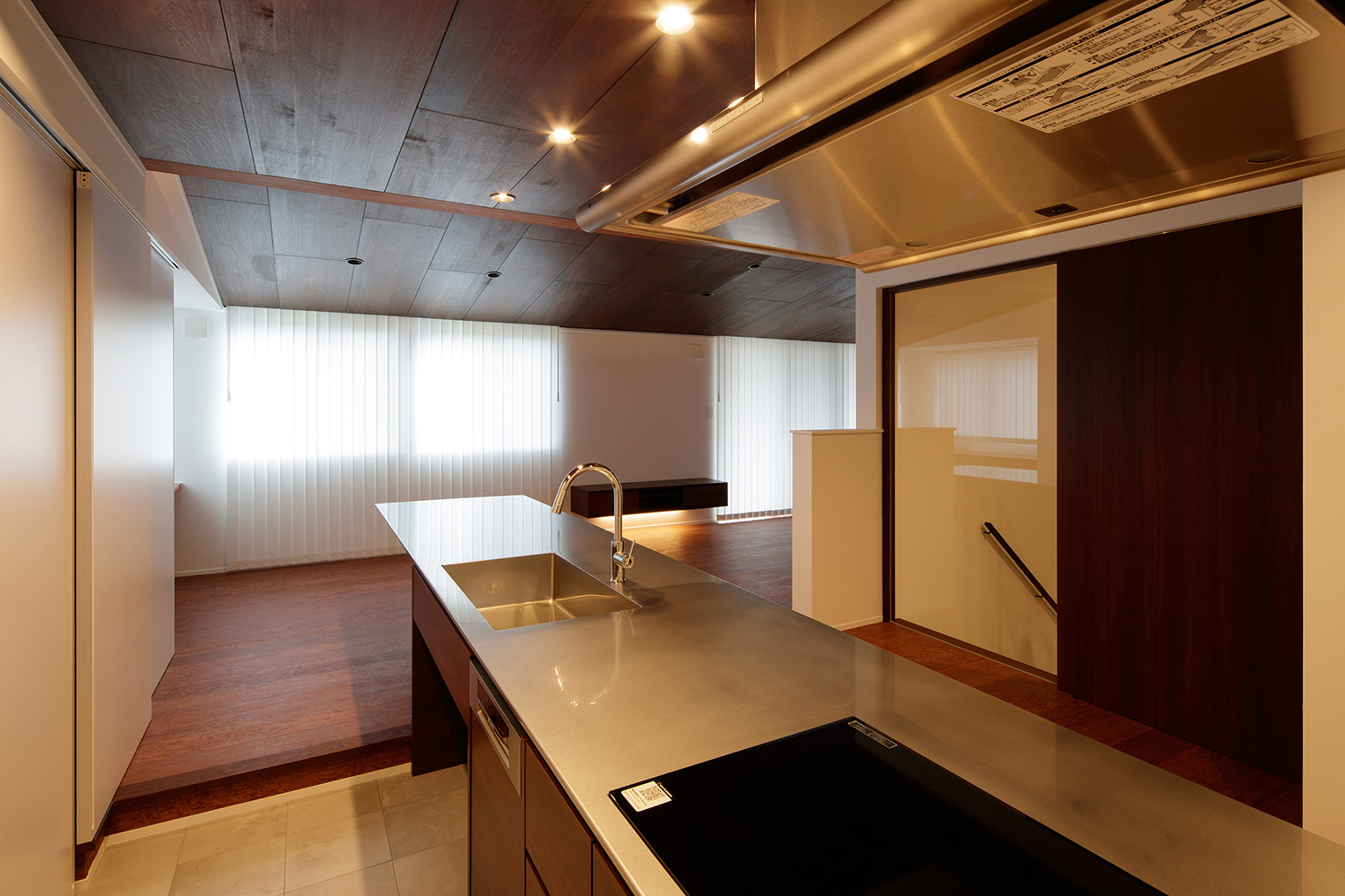 こちらの住宅のダイニングキッチンでは、ステンレス天板が伸び、食卓テーブルを兼ねています。
