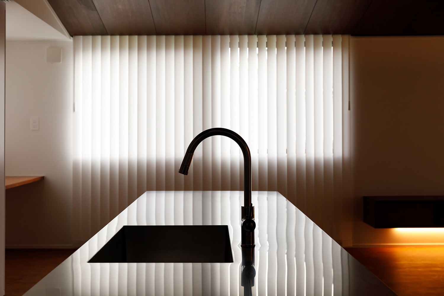 キッチンの背面には、6枚引戸のガラリ式収納を設置。その中には冷蔵庫やキッチン電化製品、食器、食材までがすべて収められます。さらに、窓際に設けたワークスペースもキッチンカウンターと同じ高さに統一することで椅子を共有。完全収納と必要最低限の家具で限られたスペースを有効活用できます。