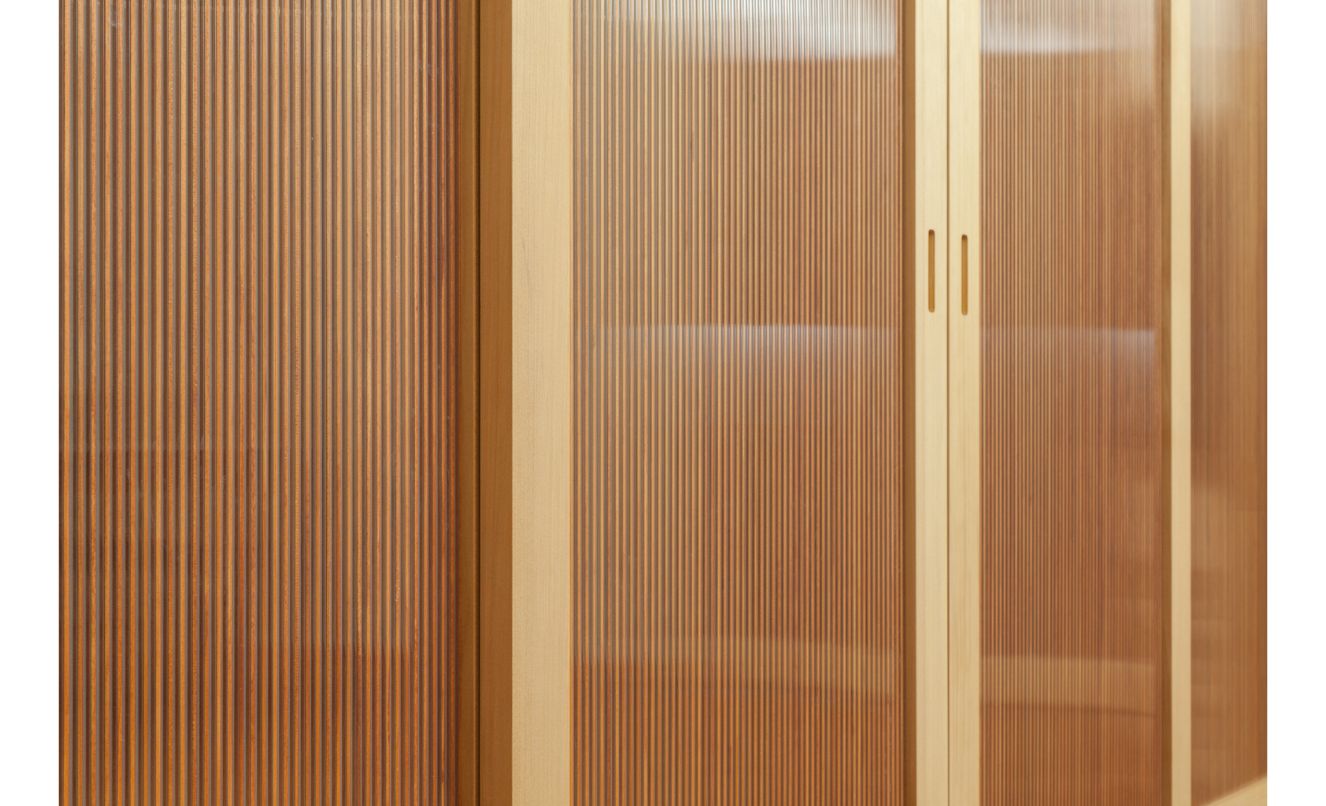 ツインカーボという2枚のポリカーボネートが中空状になった素材があるのですが、その中空部分1つ置きに細いスティック状の木材を差し込んで作成しています。内装に併せて彩色した木材を間隔を開けて差し込むことで素材の持つ透過性と意匠性を両立させました。