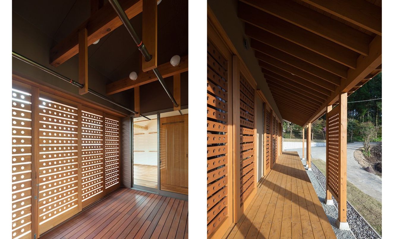 また、写真5枚目のような木製雨戸も作成することが多いです。既製のアルミ雨戸やシャッターは閉じると真っ暗になってしまい殺風景な印象ですが、木製のルーバーを丸くくり抜いた雨戸はガラスを守りながら光を通し、柔らかな表情を生み出します。バリエーションとして、メッシュを張って網戸の役割を持たせたものや、洗濯物干場に設置して通風と防犯を両立させたものなどもあります。