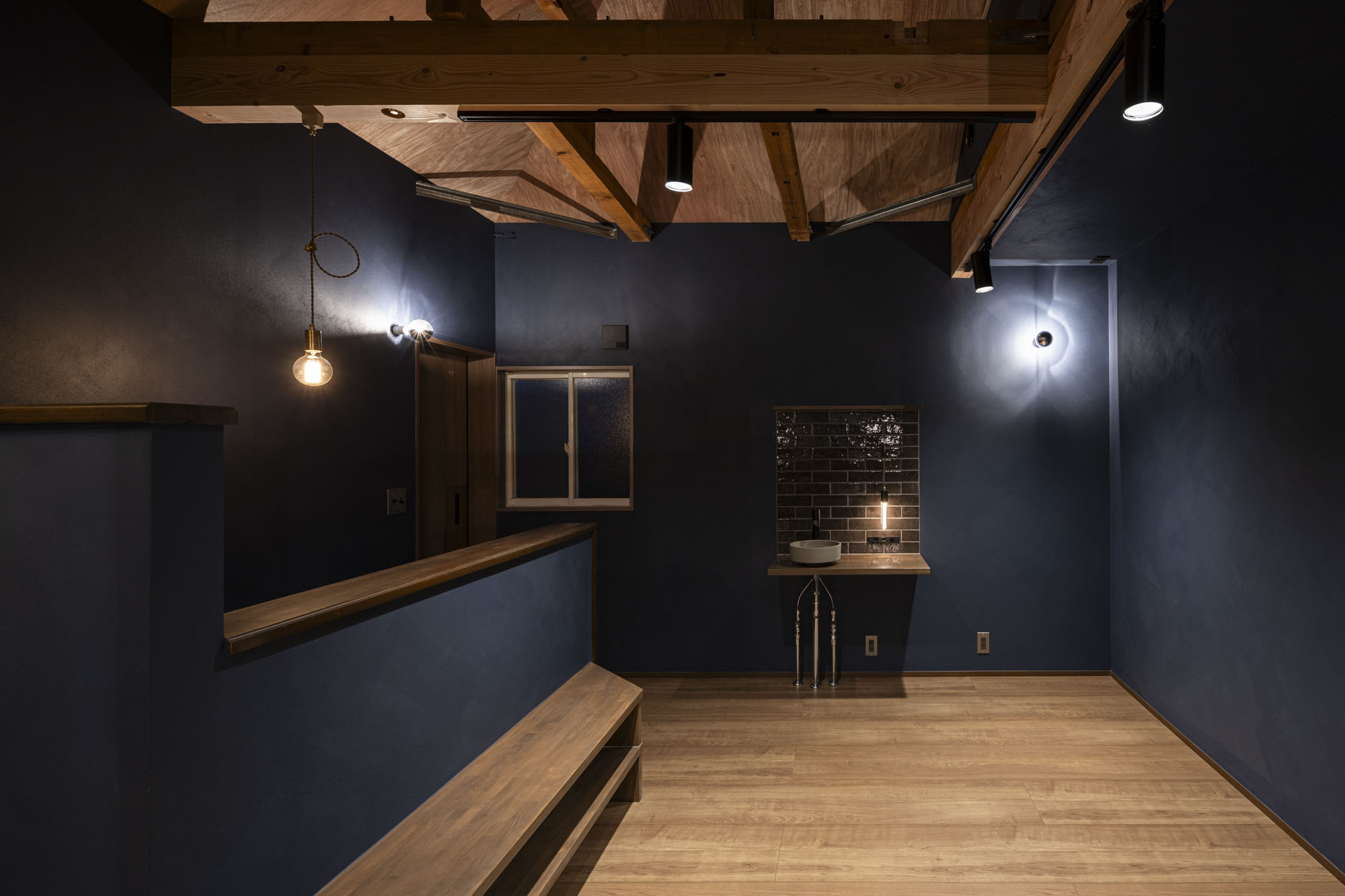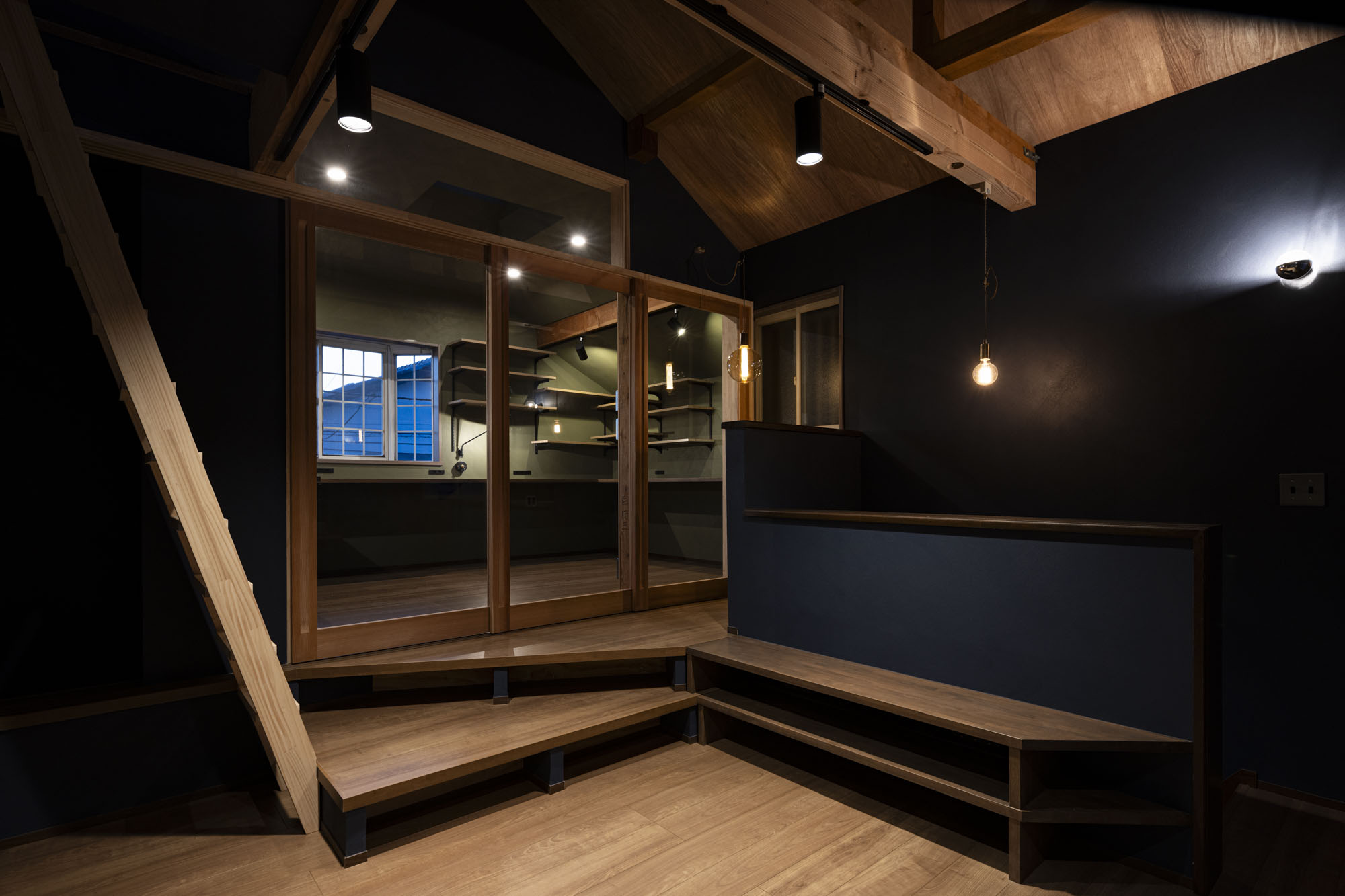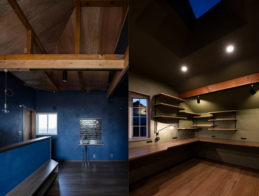 お施主様のご希望に沿って、セカンドリビングは少し暗めでこもり感のある落ち着いたデザインとなっています。この空間は仕事に集中できる一方で、リラックスできる場所にもなります。さらに、セカンドリビングには最低限の水回りを設けることで、異なる生活リズムを持つ二世帯が快適に過ごせるよう、生活の利便性とバランスを追求しました。