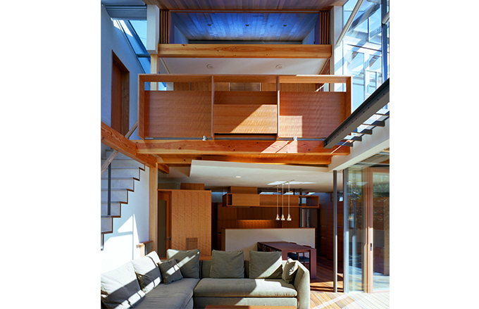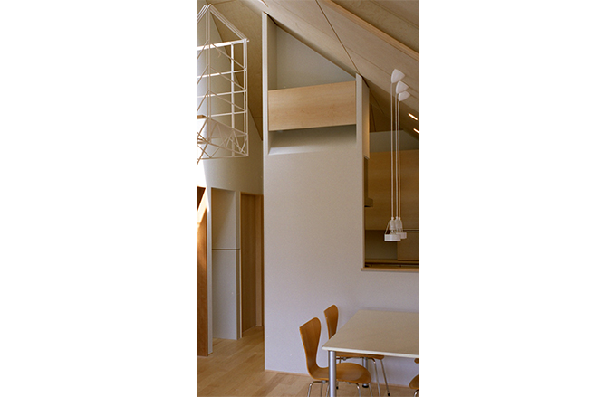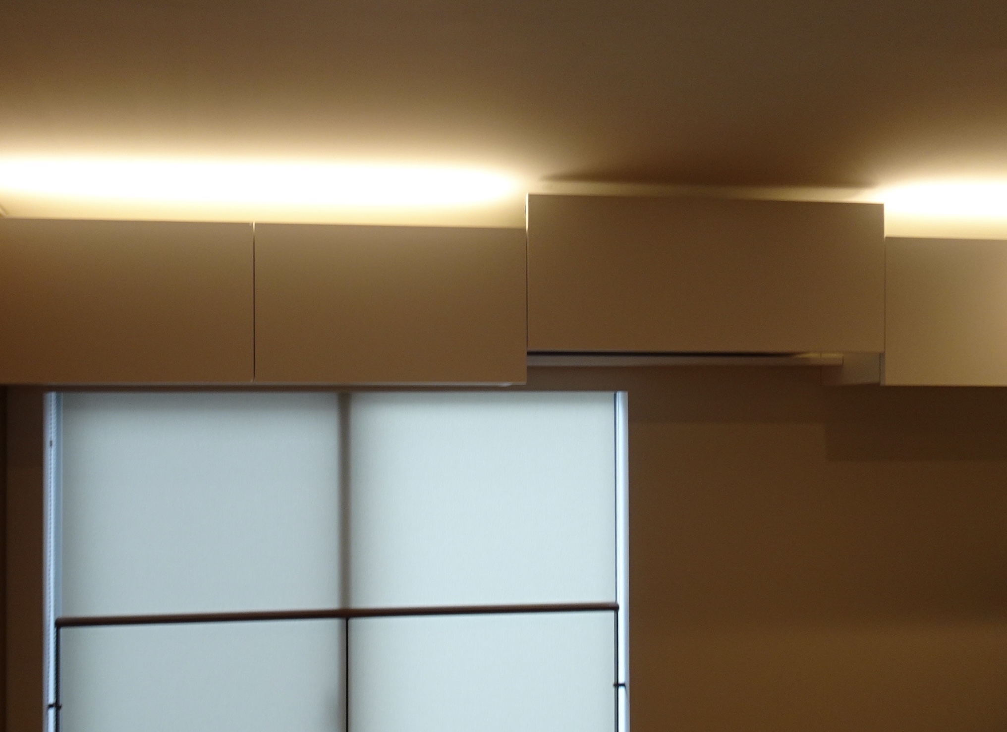 空間の中でどうしても目立ちがちなエアコン。埋め込みタイプなどもありますが、選択肢がかなり少なく、メンテナンスも一般のエアコンほど気軽ではありません。既製品の優秀なエアコンを使いながらも部屋の雰囲気を邪魔しない方法はないかと考えました。ルーバーのように格子で全体を覆う方法もありますが、これはショートサーキットが起きがちです。ショートサーキットとは吹き出した風が障害物に当たってはね返り、すぐに吸い込み口へ戻って室温を適温と勘違いしたエアコンが止まってしまうという現象です。そこでエアコンをよく観察すると冷房の風は水平方向、暖房の風は下方向に向かって風が流れていることに気づきました。そのため、エアコンの前に可動式の目隠し板を設置し、暖房の季節は下に空気が抜けるよう前に板を下ろし、冷房時期は水平方向より上に板をずらせるようにしました。それにより冬はエアコンがほぼ見えず、夏は上にずらして吹き出し口が少し見えるという形でエアコンの存在感を消しています。